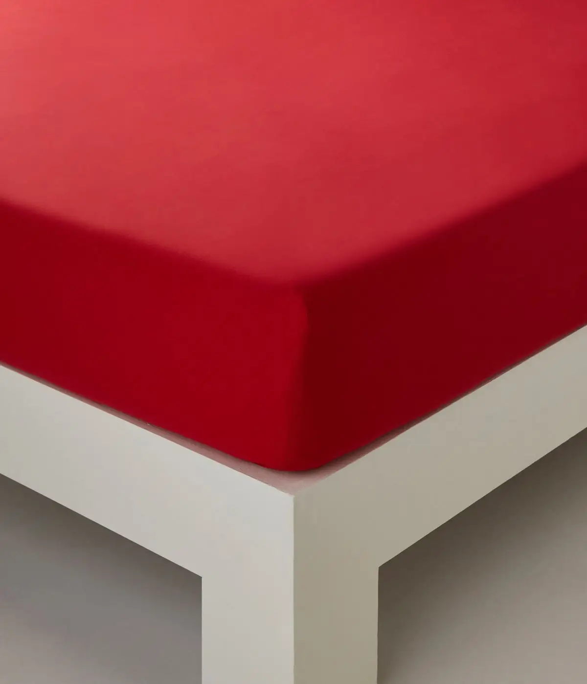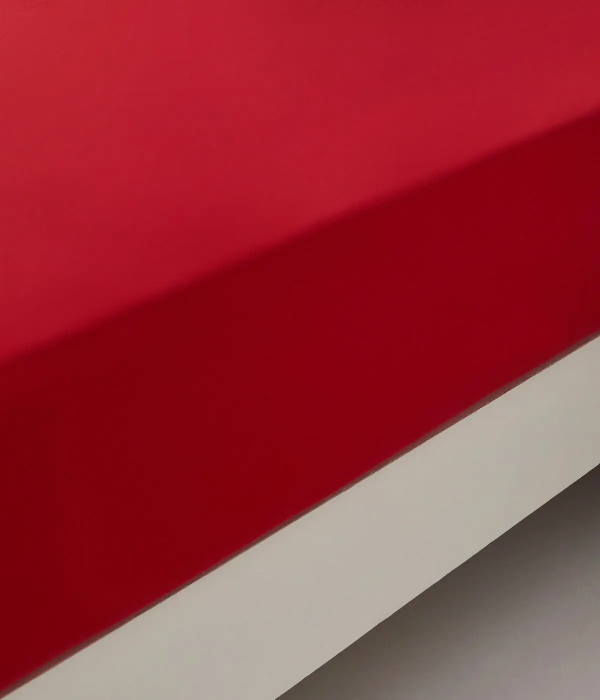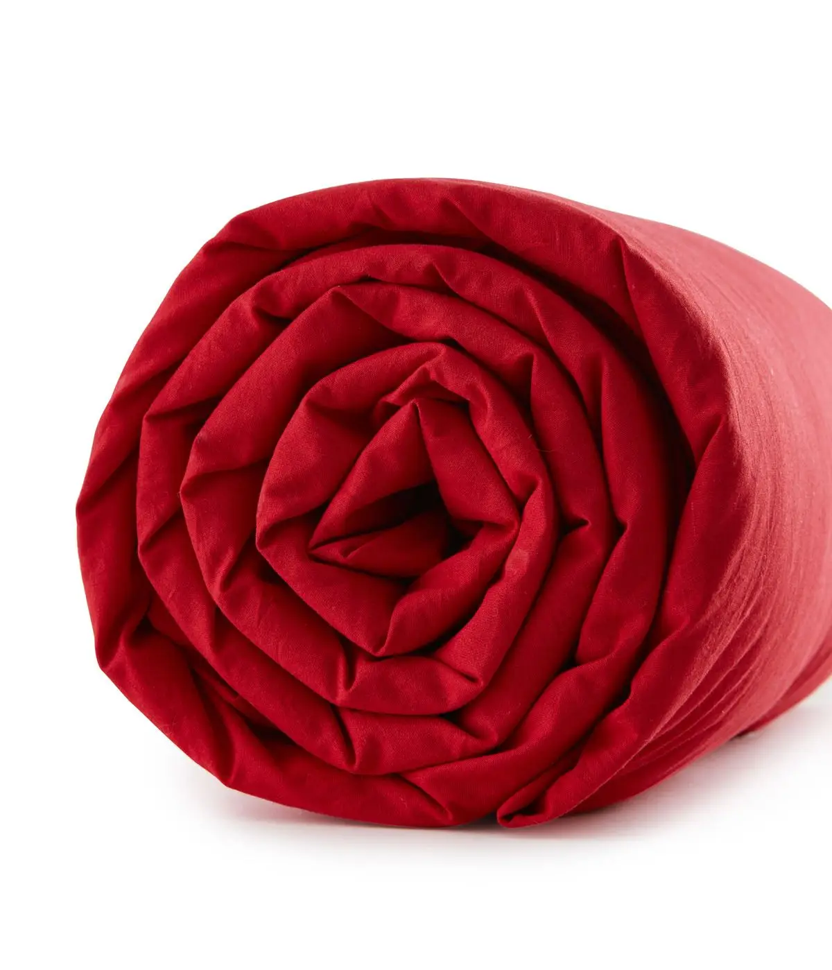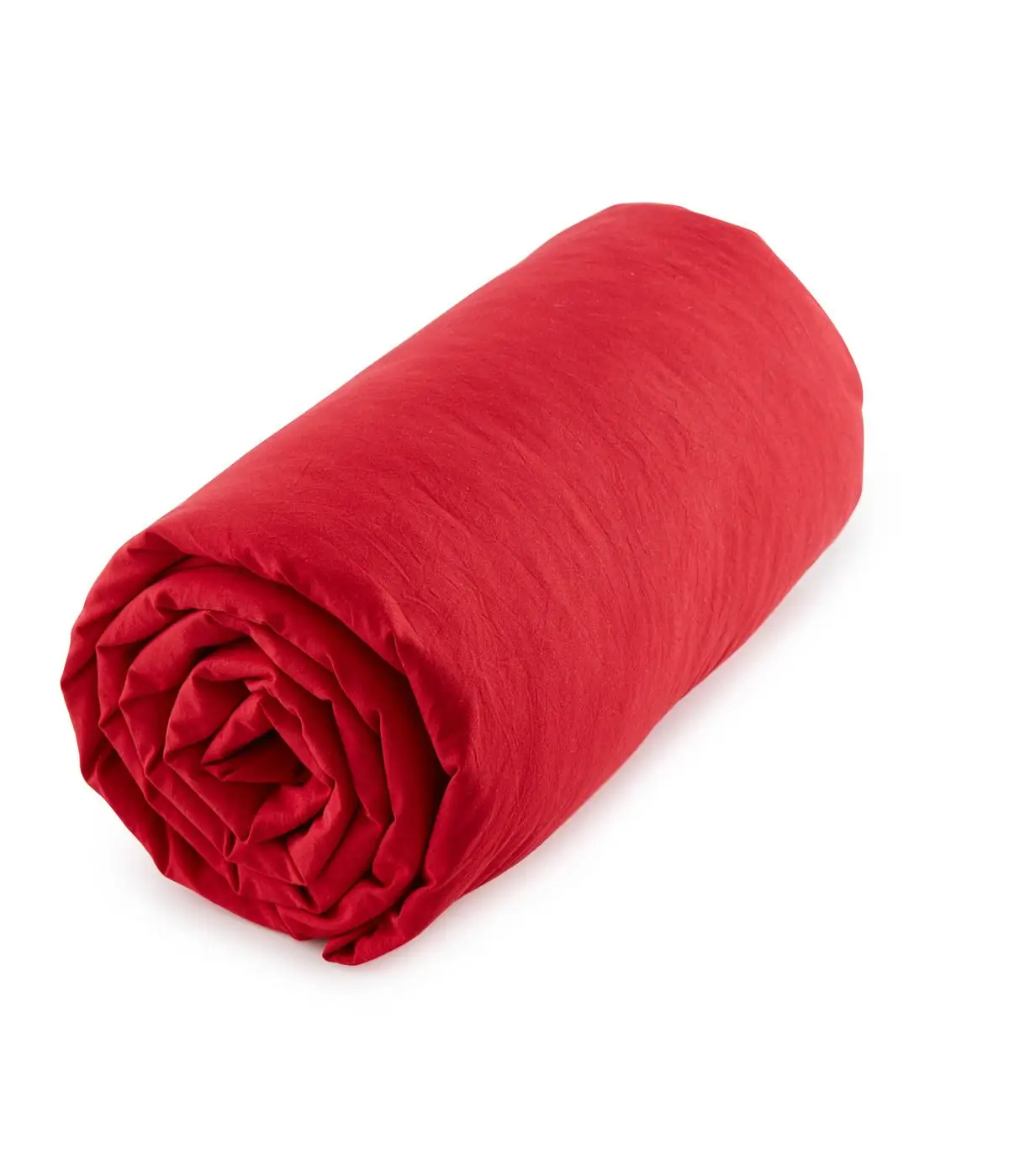 Ce drap housse s’inscrit dans la tradition des décors de montagne. Sur une percale de coton colorée dans un beau rouge intense et profond.