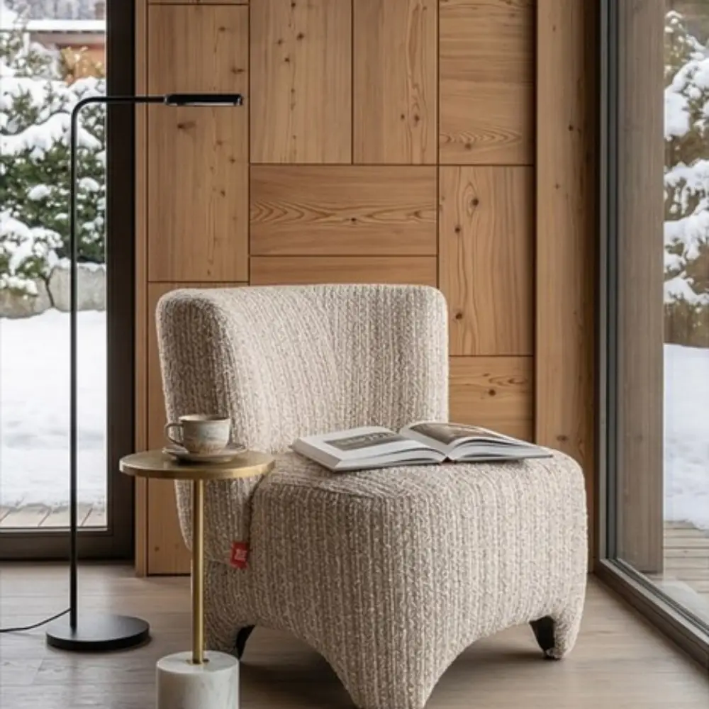 Ce fauteuil, avec sa silhouette robuste et ses courbes organiques, redéfinit l’espace lounge. Son revêtement en bouclette texturée aux nuances beige-gris apporte une profondeur visuelle et une douceur tactile incomparable, idéale pour vos moments de lecture ou de détente.