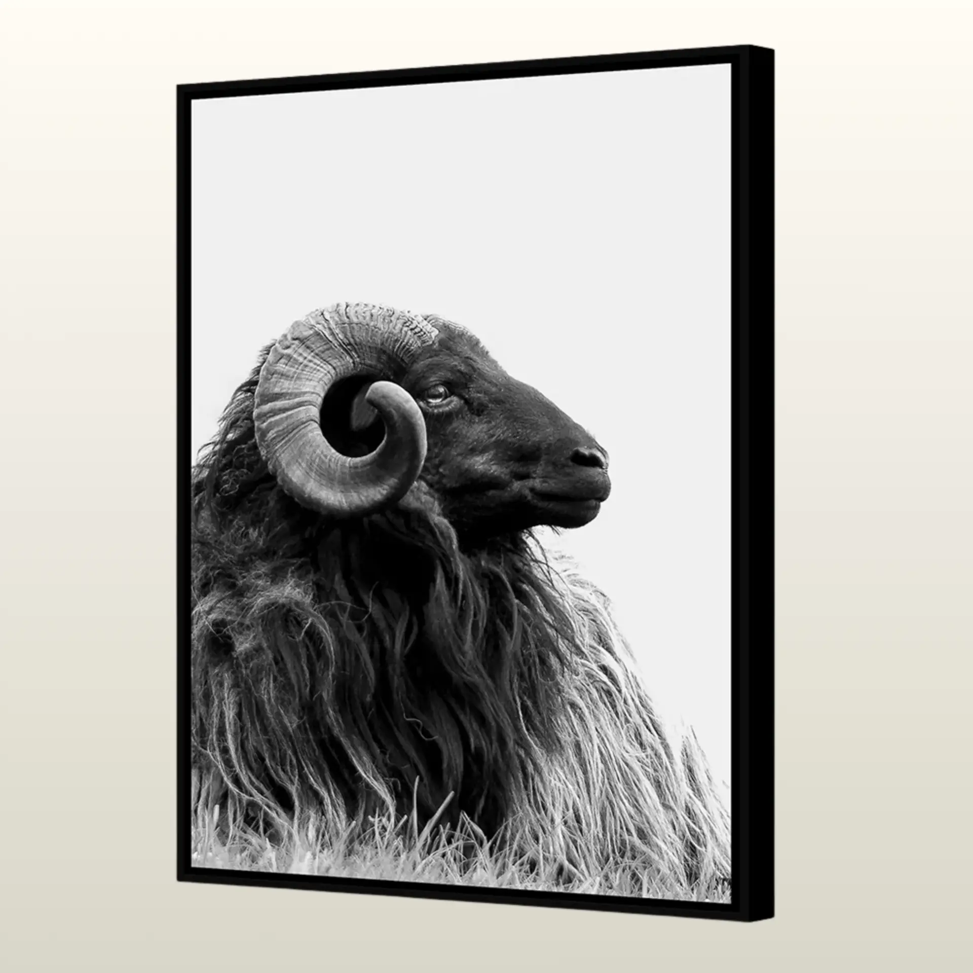 Le tableau RIM n’est pas qu’une simple photographie, c’est une rencontre. Ce bélier majestueux, avec ses cornes superbement sculptées et son pelage texturé, semble veiller sur votre pièce avec une sagesse ancestrale. Le choix du noir et blanc accentue chaque détail, des brins d’herbe au premier plan jusqu’à la profondeur de son regard, créant un contraste saisissant qui s’adapte à toutes les ambiances.